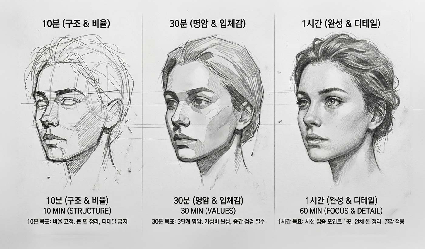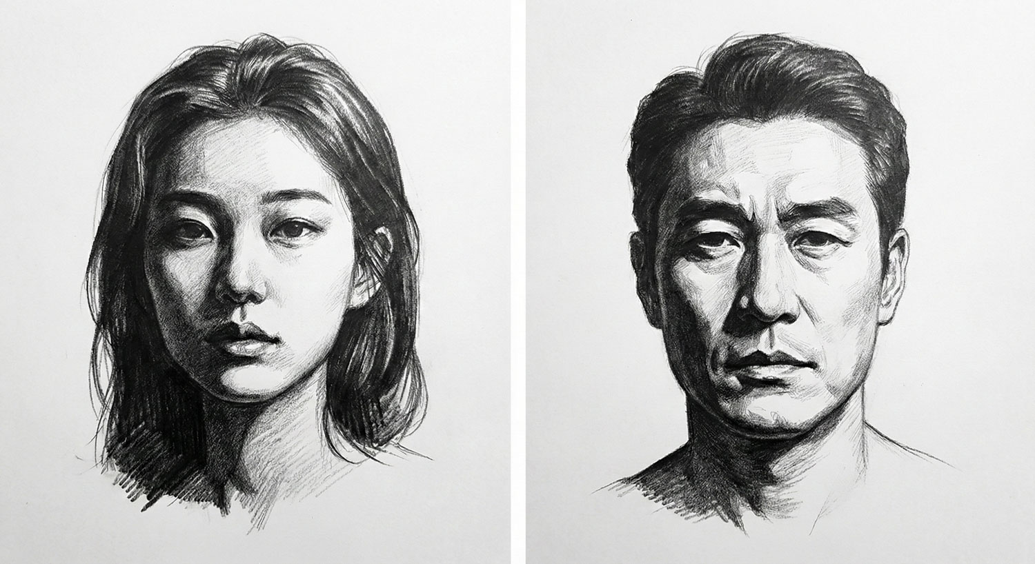 연필 인물화 데생을 처음 시작하면 누구나 비슷한 지점에서 무너집니다. 눈이 자꾸 올라가고, 턱이 이상하게 짧거나 길어지고, 머리카락을 그리면 머리통이 납작해집니다. 이 세 가지는 그리는 실력의 문제가 아니라 보는 방식과 접근 순서의 문제입니다. 원인을 정확히 알고, 그림을 시작하기 전에 체크 포인트를 확인하는 습관만 들여도 결과물이 완전히 달라집니다. 이번 포스팅은 이 3대 체크포인트를 하나씩 확인하고, 실전에서 바로 쓸 수 있는 방법을 정리합니다.체크포인트 1. 눈선: 왜 자꾸 위로 올라가는가인물화 데생에서 가장 흔하고 가장 치명적인 실수입니다. 완성된 그림을 멀리서 보면 눈이 이마 쪽에 붙어 있어 인물이 놀란 표정처럼 보이거나, 얼굴 전체가 짧고 납작해 보입니다. 그런데 정작 그리는 동안에는 이 문제..