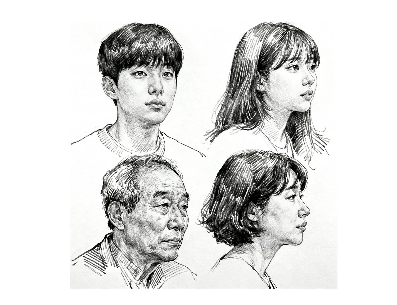 동일한 기본 구조를 가진 얼굴도 작은 차이로 완전히 다른 인상을 만들 수 있습니다. 표정과 디테일의 변화가 바로 개성 있는 인물화를 완성시키는 열쇠입니다.