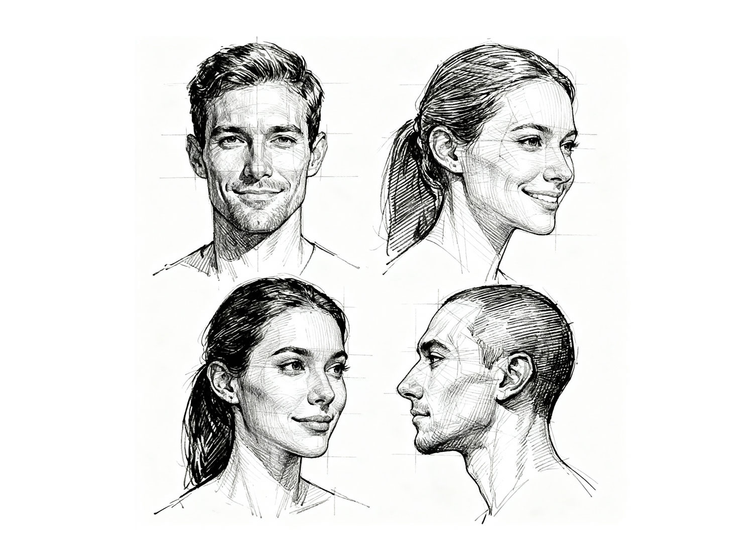 ✓ 측면도(Profile View) - 코, 입, 턱의 형태가 중요합니다. 정면도에서는 보이지 않는 얼굴의 깊이와 특징을 표현할 수 있습니다.