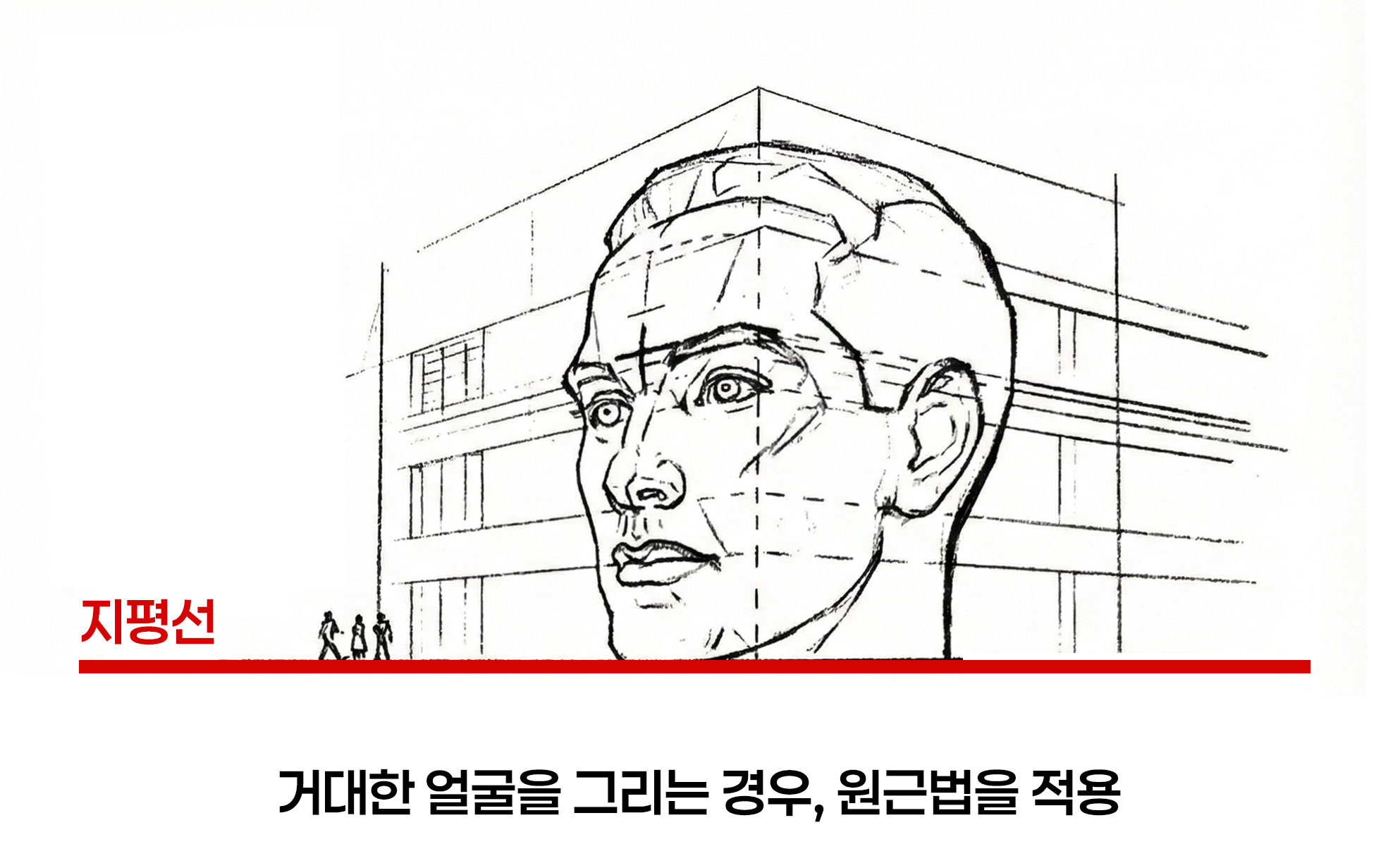 물론 예외는 있습니다. 제가 참고한 자료(첫번째 첨부 이미지)를 보면, 거대한 건물만큼 큰 '거인 두상 석상'이 지평선 위에 놓여 있는 그림이 있습니다. 이런 상황이라면 당연히 원근법을 적용해야 합니다.