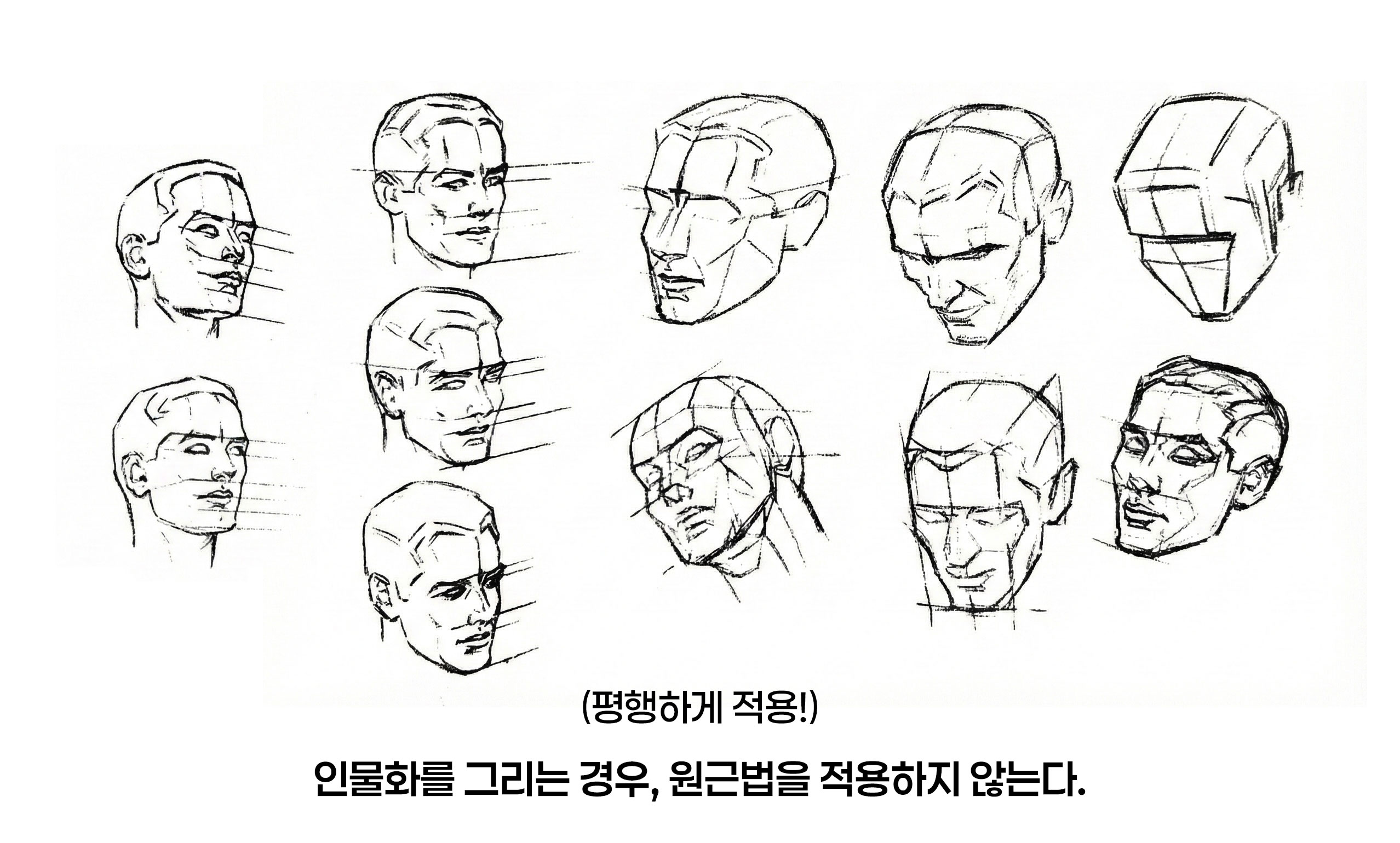 위 예시 이미지를 보면, 다양한 각도로 회전된 얼굴들이 그려져 있습니다. 여기서 주목해야 할 점은 얼굴을 가로지르는 가이드라인들입니다. 눈썹 라인, 눈의 라인, 코밑 라인, 입술 라인, 턱 라인이 소실점으로 모이지 않고 서로 평행하게 뻗어 나가고 있습니다.