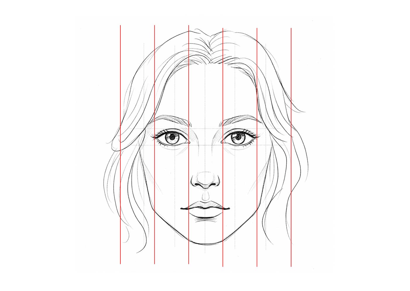수직 분할선을 그을 때는 얼굴이 완전히 정면을 보고 있는지 확인해야 합니다. 약간의 각도가 있더라도, 얼굴의 특징이 비대칭이 되면 부자연스러워 보입니다. 따라서 처음 연습할 때는 항상 정면의 얼굴부터 시작하는 것이 좋습니다.