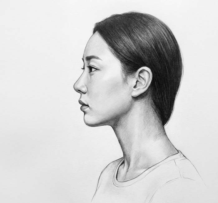 완전 측면은 인물을 정확히 옆에서 본 시점입니다. 이 각도에서는 이마-코-입술-턱으로 이어지는 S라인이 얼굴의 모든 것을 결정합니다. 측면은 정면보다 더 어렵지만, 일단 익히면 인물의 개성을 가장 극적으로 표현할 수 있는 각도입니다.